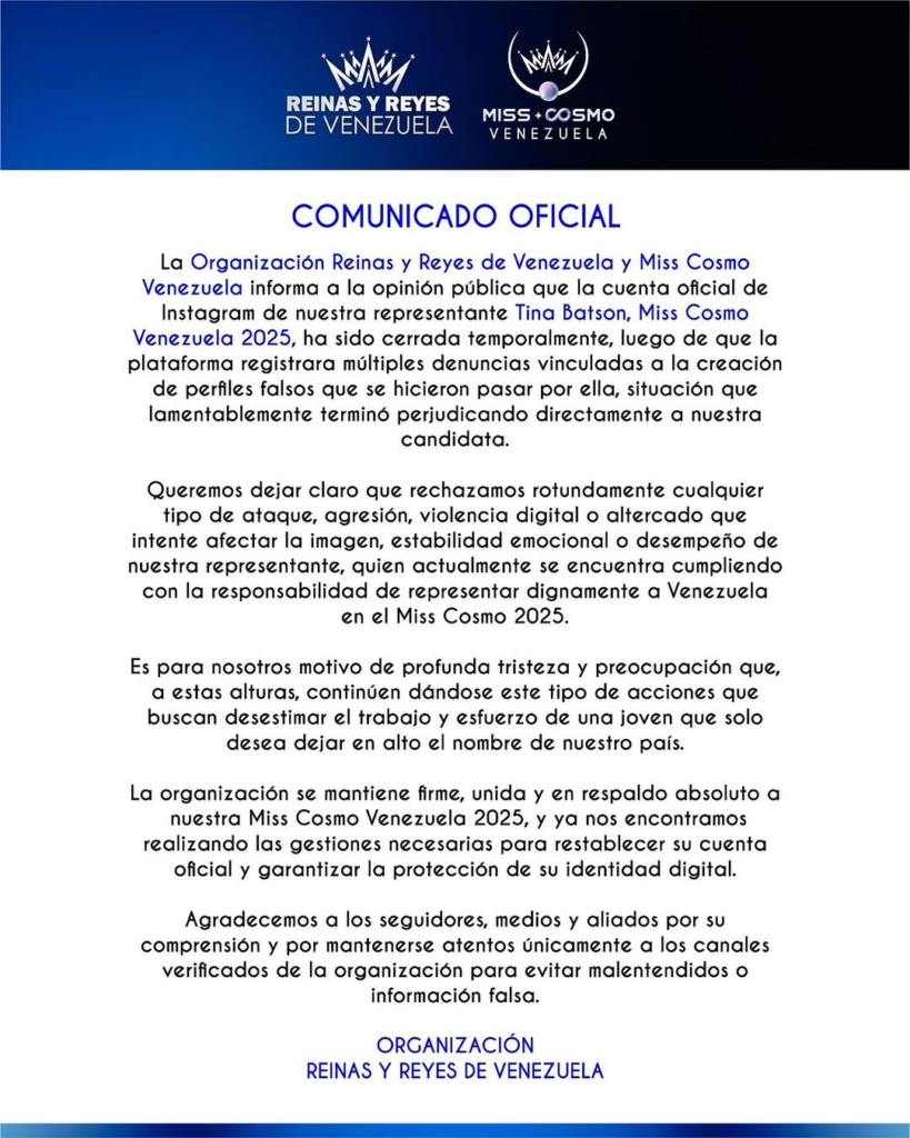 «La organización se mantiene firme, unida y en respaldo absoluto a nuestra Miss Cosmo Venezuela 2025, y ya nos encontramos realizando las gestiones necesarias para restablecer su cuenta oficial y garantizar la protección de su identidad digital», destacó el texto.