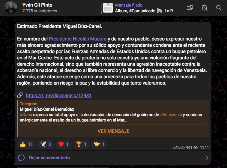 «Estimado presidente Miguel Díaz-Canel, en nombre del presidente Nicolás Maduro y de nuestro pueblo, deseo expresar nuestro más sincero agradecimiento por su sólido apoyo y contundente condena ante el reciente asalto perpetrado por las Fuerzas Armadas de Estados Unidos contra un buque petrolero en el Mar Caribe», cita la publicación del canciller.
